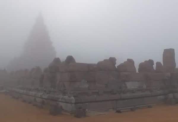 மாமல்லபுரம், : மாமல்லபுரம் பகுதியில் பொழிந்த மூடுபனியில், பனித்திரை சித்திரமாக, சிற்பங்கள் வசீகரித்தன.